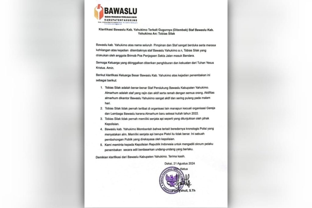 Hal itu diakui oleh Bawaslu Yahukimo dalam sebuah terbitan surat klarifikasi yang berjudul “Klarifikasi Bawaslu Kab. Yahukimo Terkait Gugurnya (Ditembak) Staf Bawaslu Kab. Yahukimo An: Tobias Silak”.