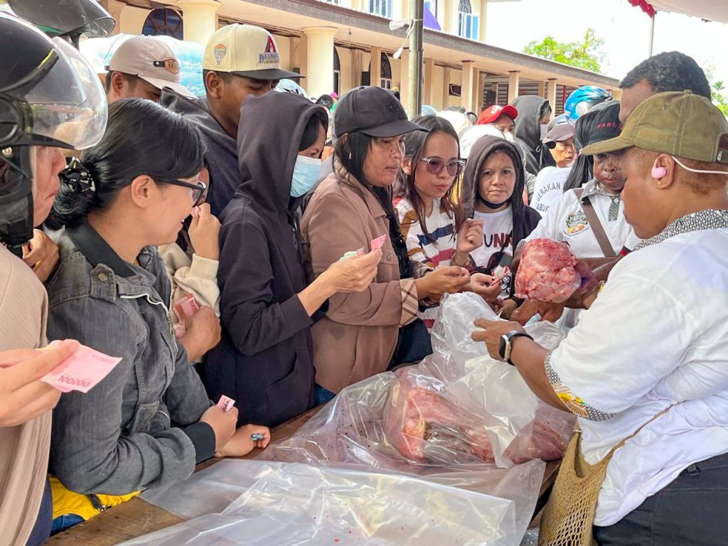 Dinas Ketahanan Pangan Mimika menyediakan daging babi yang telah disubsidi untuk dijual di pasar murah di Gereja GKI Diaspora, Jalan Cendrawasih, Timika, Papua Tengah, Selasa (17/12/2024). (Foto: Galeri Papua/Endy Langobelen)